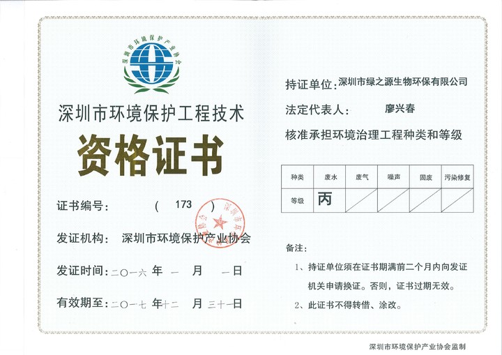 深圳市環(huán)境保護(hù)工程技術(shù)資格證書